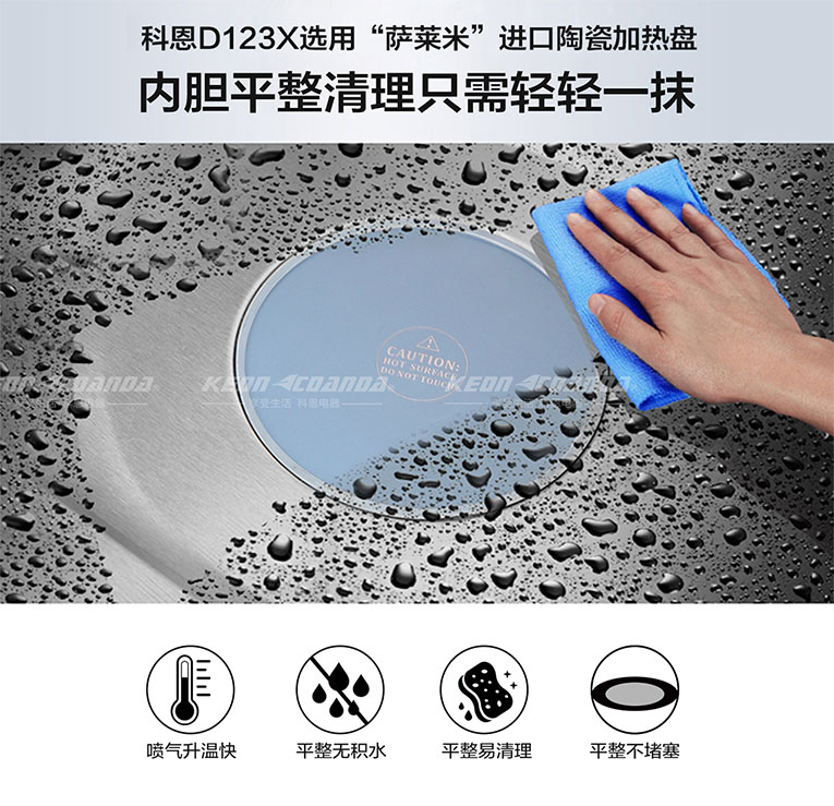 集成灶十大品牌、廚電行業十大品牌科恩D123X變頻蒸烤消一體智能集成灶采用噴氣式4D立體蒸+底部陶瓷加熱盤,0-120℃僅需200秒,內腔頂部兩組加熱管,四面受熱均勻、營養不流失,防止了蒸汽上升,保證頂部不漏水,烹飪開胃菜、湯品、魚、蔬菜、五谷雜糧蒸無不透;底部薩萊米陶瓷加熱盤噴氣升溫快、平整無積水、易清理、不堵塞,內膽平整只需輕輕一抹就能潔凈;62L大容積蒸箱,一次蒸多種食物不串味,30分鐘就能搞定一大桌菜!