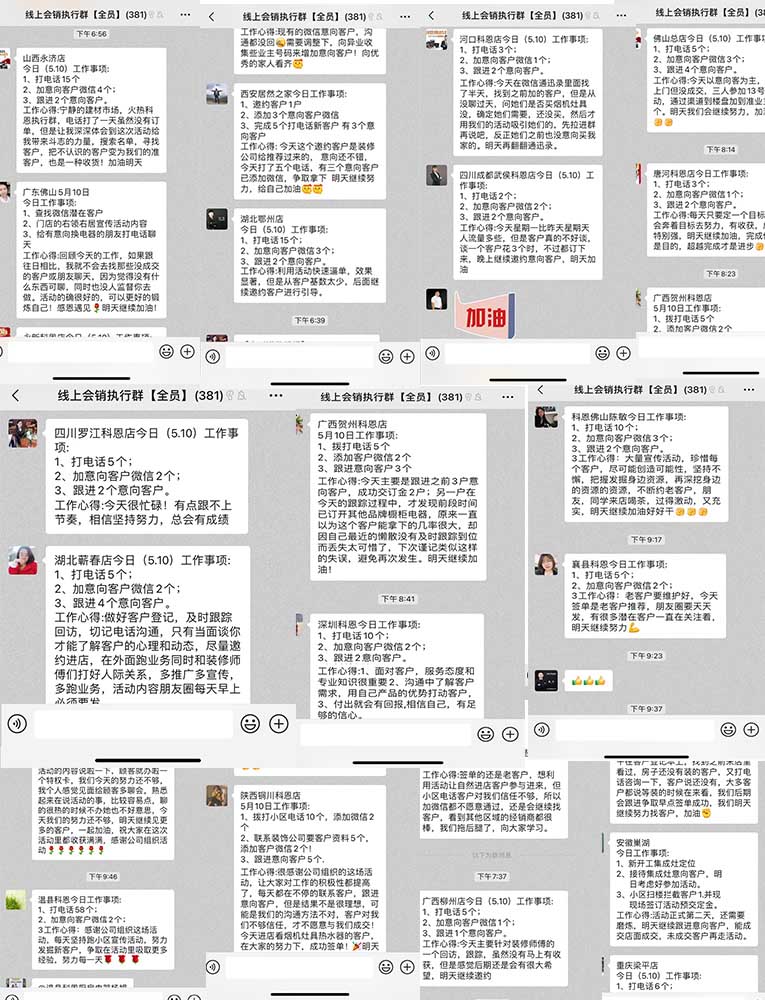 微信超級廠購會,定計劃,定目標,提升學習力,增強執行力,凝聚戰斗力,總部操盤賦能終端,助力于門店市場運營,帶領科恩家人一路摸高,高效打造有溫度有實體感的戰斗集體。