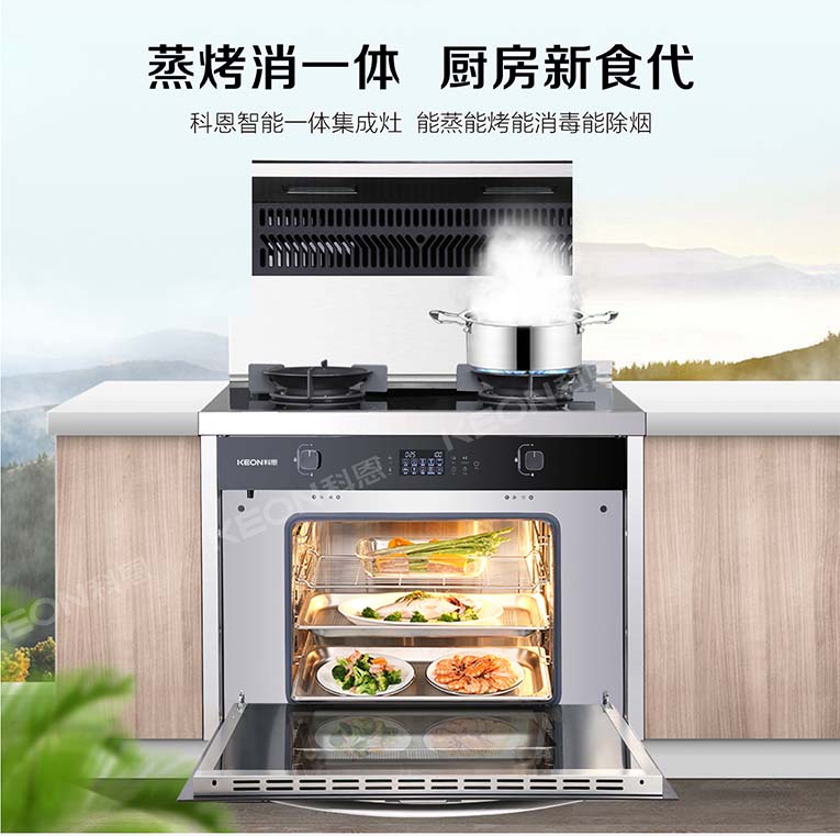 集成灶十大品牌、廚電行業十大品牌科恩變頻大吸力蒸烤消一體集成灶多種模式任你選擇,蒸煮煎炸炒燉樣樣精通,精準溫控精控火候,鎖住每一份原汁原味,輕松樂享智慧烹飪,實現更高效、節能、多樣化模式。