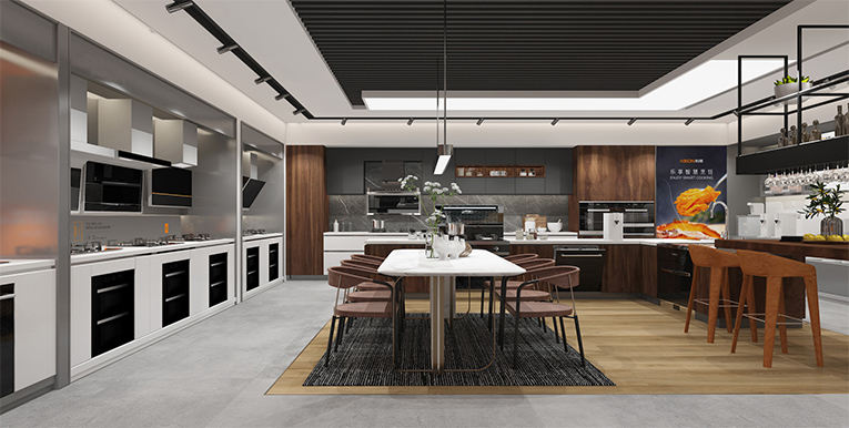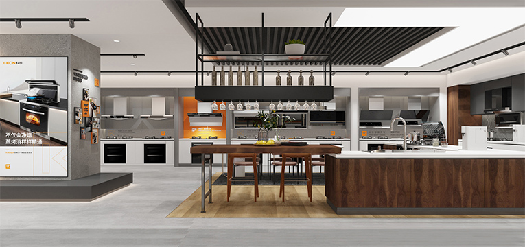 科恩新門(mén)店簡(jiǎn)約、大氣、精美的視覺(jué)沖擊讓人印象深刻,開(kāi)放式瀏覽路徑,通過(guò)“視覺(jué)+產(chǎn)品+體驗(yàn)”的融合,以差異化彰顯品牌個(gè)性,讓消費(fèi)者通過(guò)感知產(chǎn)品來(lái)感受品牌,對(duì)多個(gè)區(qū)域進(jìn)行場(chǎng)景重構(gòu),產(chǎn)品陳列區(qū)、廚房場(chǎng)景、品牌背書(shū)、洽談區(qū)等,通過(guò)模塊化的方式,將核心產(chǎn)品模塊以及開(kāi)放式廚房體驗(yàn)場(chǎng)景植入門(mén)店。