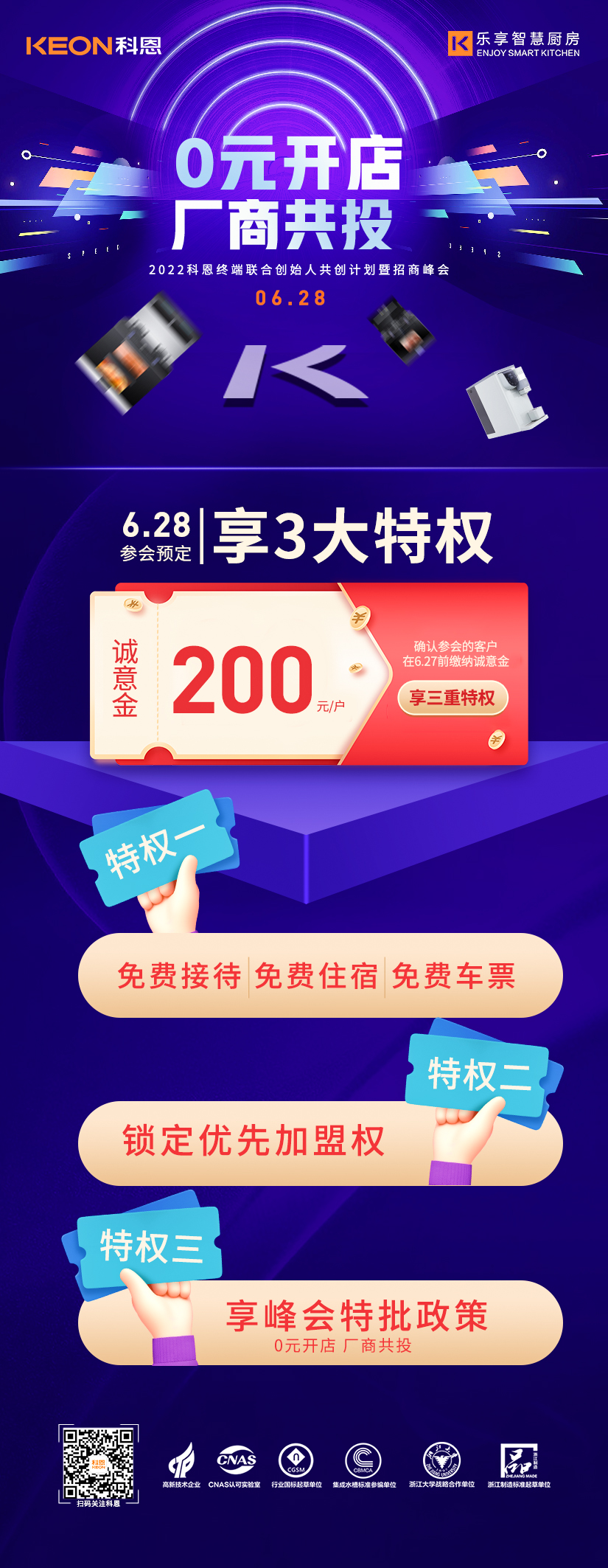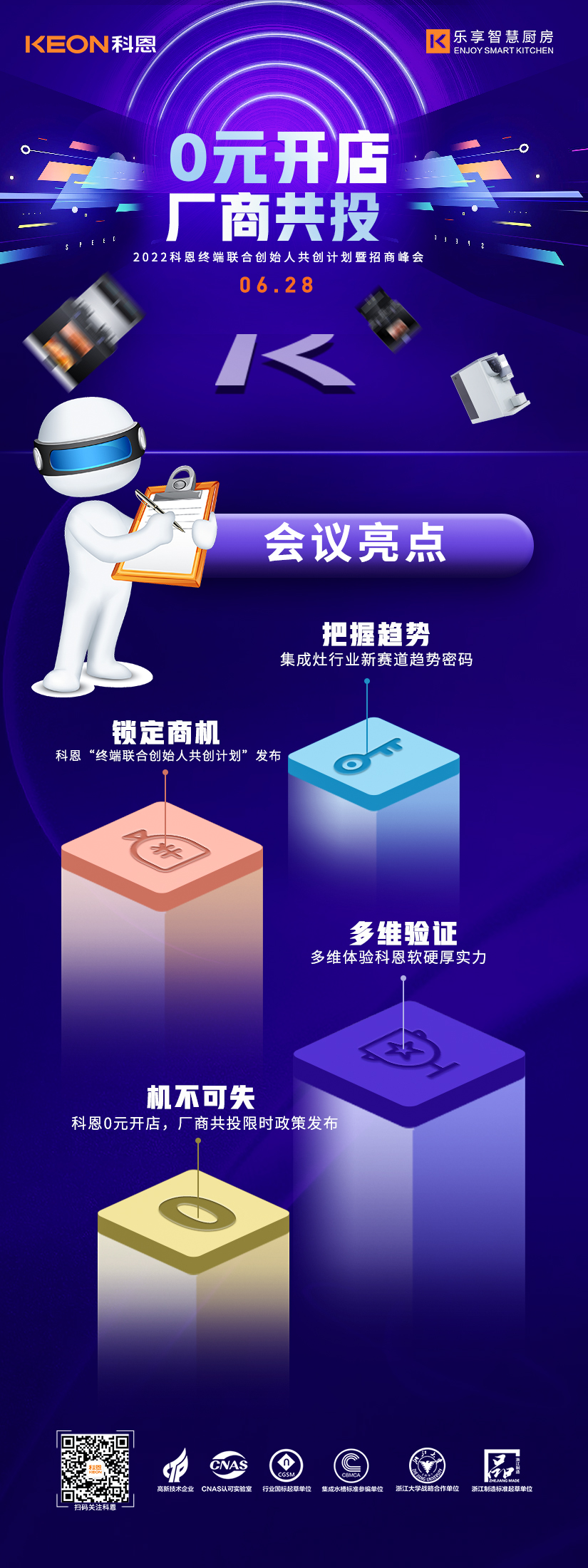 6月28日2022科恩終端聯合創始人共創計劃暨招商峰會將在廚具之都嵊州隆重舉辦,本次峰會將以“0元開店,廠商共投”為主題,邀請來自全國各地的行業精英、投資大佬匯聚一堂,共同探討廚電行業發展趨勢,解鎖集成灶行業新賽道趨勢密碼,多維驗證科恩集團軟硬厚實力,屆時,將為各位來賓解讀限時政策內容,為各位投資人提供一個潛力無限,共創霸業的優秀共創平臺。