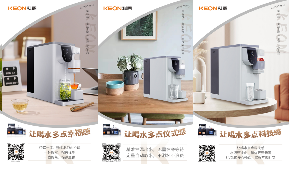 清晨早起的第一杯水,承載著一天的愉悅和舒心,科恩R6068集成式凈水器,精準控溫出水,無需在旁等待,定量自動取水,不溢杯不浪費,用一杯甘甜好水喚醒全身細胞,激活新陳代謝,元氣滿滿。科恩R6068免安裝自由擺放,客廳、廚房、臥室、書房,到哪都可以喝上放心水,溫度、水量、濾芯壽命實時顯示,水質監測,一目了然。RO反滲透技術,凈飲出水只需3秒,過濾精度高達0.0001微米,大約是頭發絲的百萬分之一,鮮活凈飲,凈在咫尺;旋轉式濾芯設計,一步到位,一旋一提,輕松更換,安全感滿滿,幸福感爆棚!