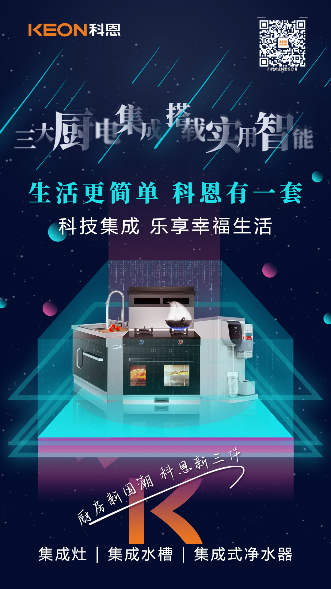 為此,科恩集成灶延續“樂享智慧廚房”理念,立足創新,大膽突破固有思維定式,跳出單品同質化現狀,勾勒出了“廚房新國潮,科恩新三件”為主題的未來廚房場景——以集成灶為代表的“烹”為中心、以集成水槽洗碗機為代表的“洗”為中心、以集成式凈水器的“飲”為中心,整合了科恩電器全系產品資源,構建多層次、全體系的廚房體驗,為用戶提供更立體、更豐富的廚房解決方案!