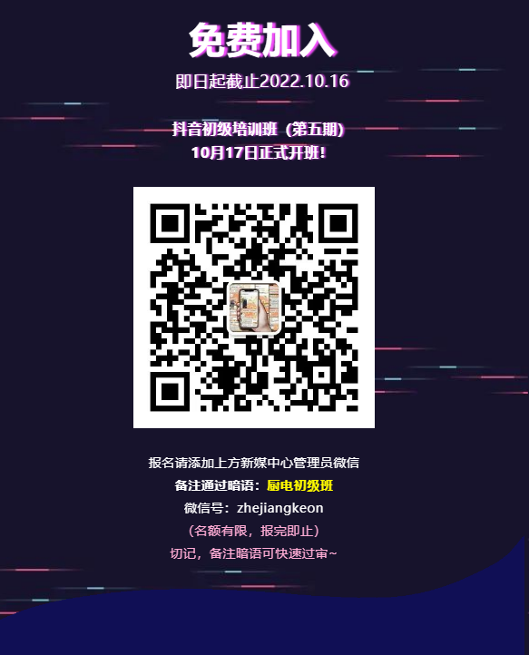 目前,第五期抖音實戰訓練營初級班已全面啟動,欲報從速!歡迎在此留言報名或者添加科恩新媒體官方微信搶占名額!科恩新媒體官方微信:zhejiangkeon