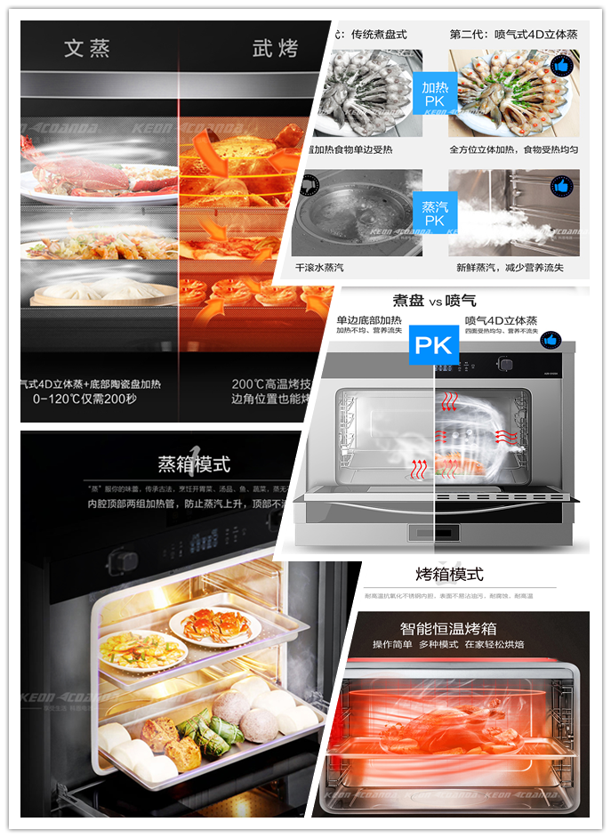 與此同時,科恩集成灶采用側吸下排的方式,嚴格把握10-20cm黃金攏煙區,吸力直逼煙源,截斷油煙路徑,內置直流變頻電機,油煙吸盡系統,提供澎湃動力,爆吸技術高達21m3/min,吸煙能力更強,煮婦(夫)們再也不用天天和油煙“戰斗”。更值得一提的是,科恩集成灶實用性特別強,如科恩智能蒸烤消一體集成灶擁有62L黃金容量空間,四層蒸烤架設計,一次可蒸制一桌菜,多種蒸烤模式隨心選擇,甜品、點心、烤雞等美食想吃就吃??贫髦悄苷艨鞠惑w集成灶采用4D立體直噴蒸烤模式,更能精準控溫,蒸汽動態平衡技術保證多種食材同時烹飪不串味,外置隱藏式水箱,輕輕一按即可自動彈出,加水更方便省心,有了TA煮婦(夫)們做飯不再手忙腳亂,輕松烹飪一桌大餐!