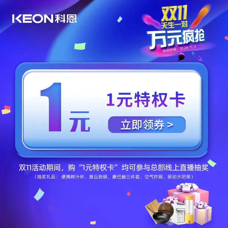 雙十一活動(dòng)期間,凡購1元特權(quán)卡即可參與總部線上直播大抽獎(jiǎng),便攜榨汁杯、章丘鐵鍋、康巴赫三件套、空氣炸鍋、移動(dòng)水吧等萬元豪禮送不停