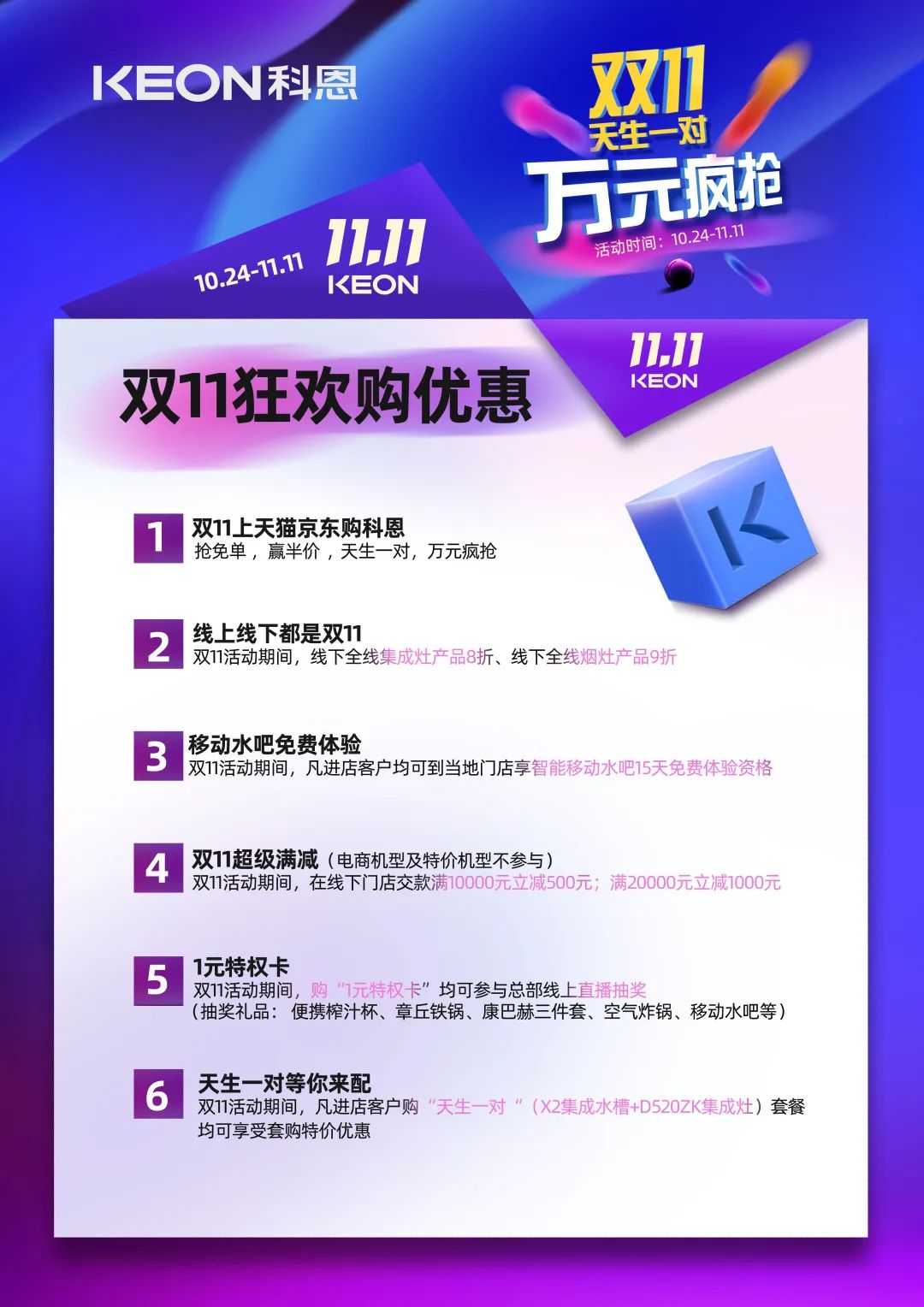 10月24日-11月11日,全國科恩門店、天貓、京東,三點(diǎn)聯(lián)動(dòng),線上線下都是雙11!
