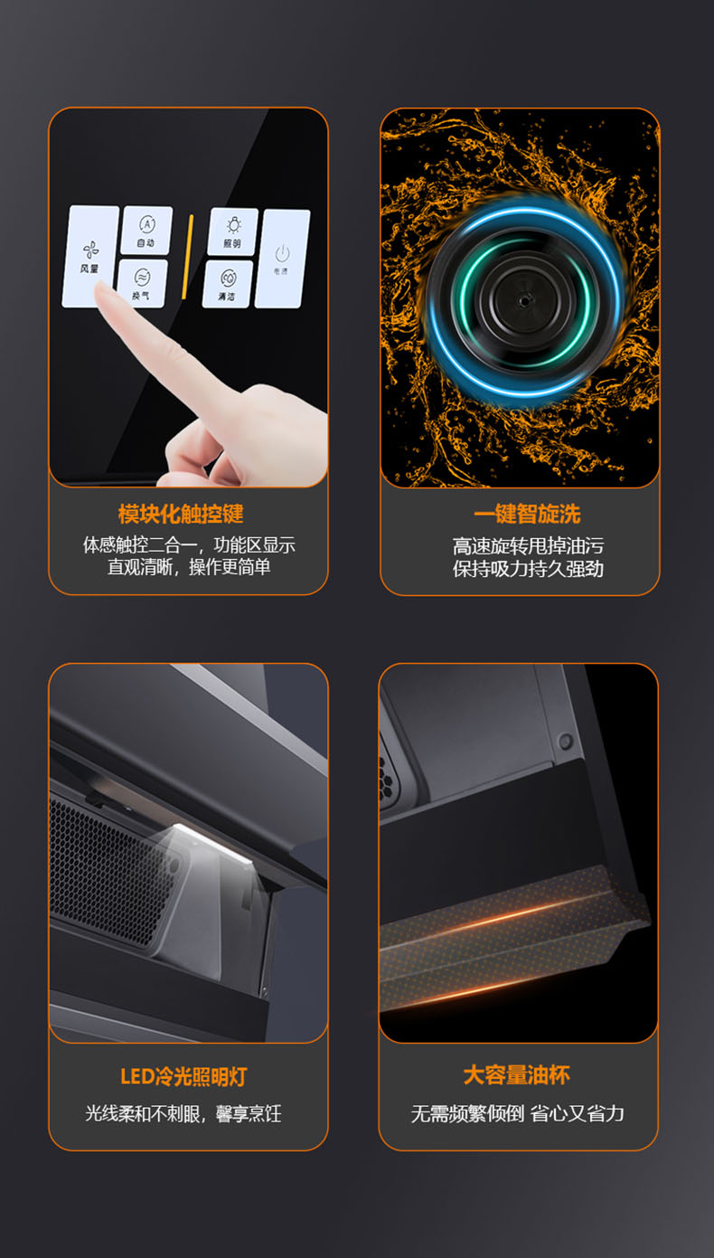采用58°黃金開合角,緊鎖油煙不逃逸